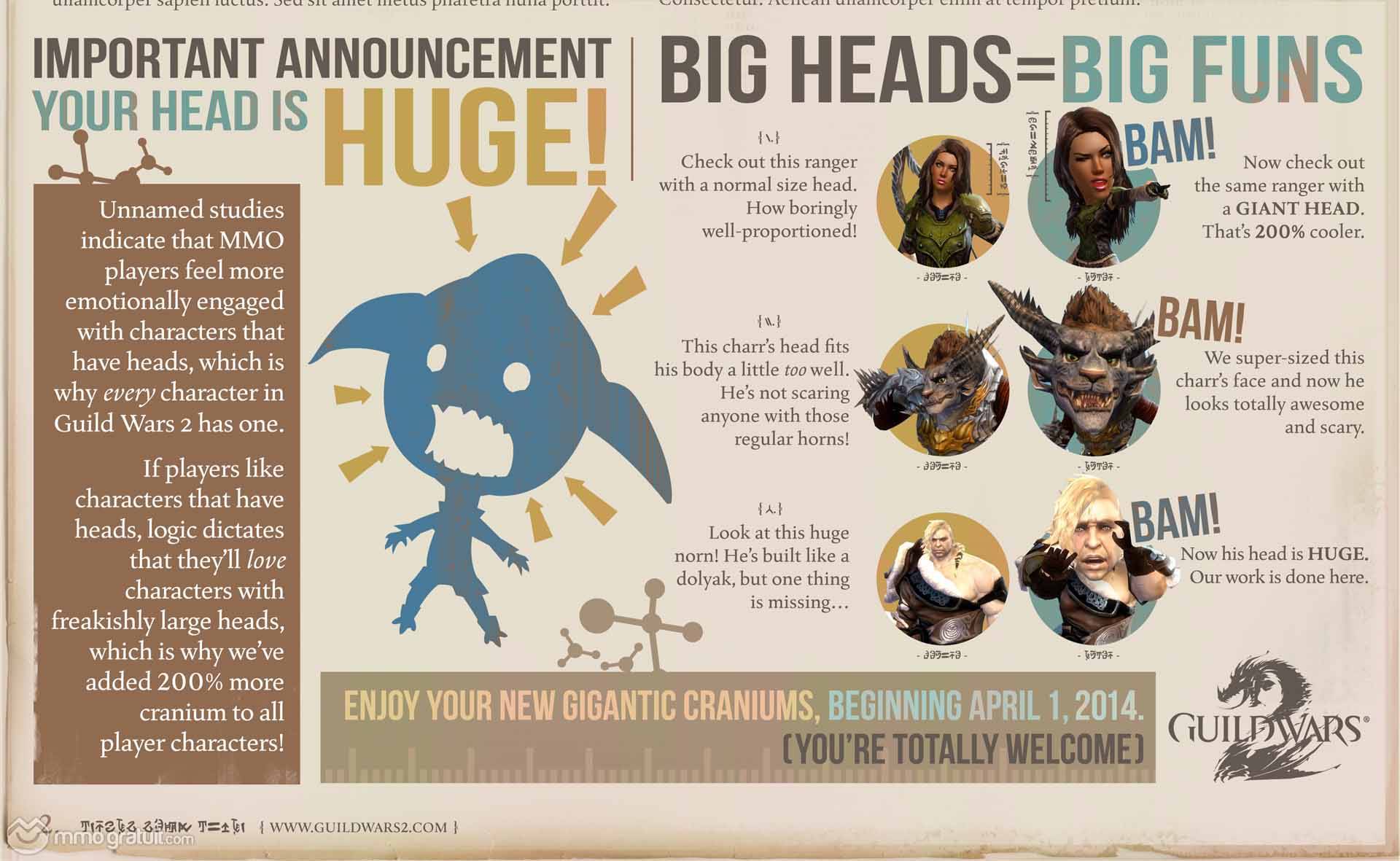 Guild Wars 2 - newsGuild Wars 2 invite les joueurs à profiter de leurs personnages munis des têtes géantes.